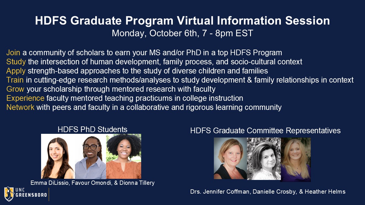 HDFS Graduate Program Virtual Information Session - October 6thMonday, October 6, 2025 at 7:00 PM until 8:00 PMEastern Daylight Time UTC -04:00 Join a community of scholars at UNC Greensboro to earn your MS and/or PhD in a top HDFS Program. Learn more about our program from a panel of students and faculty.Registration is no longer available because the registration deadline has passed.