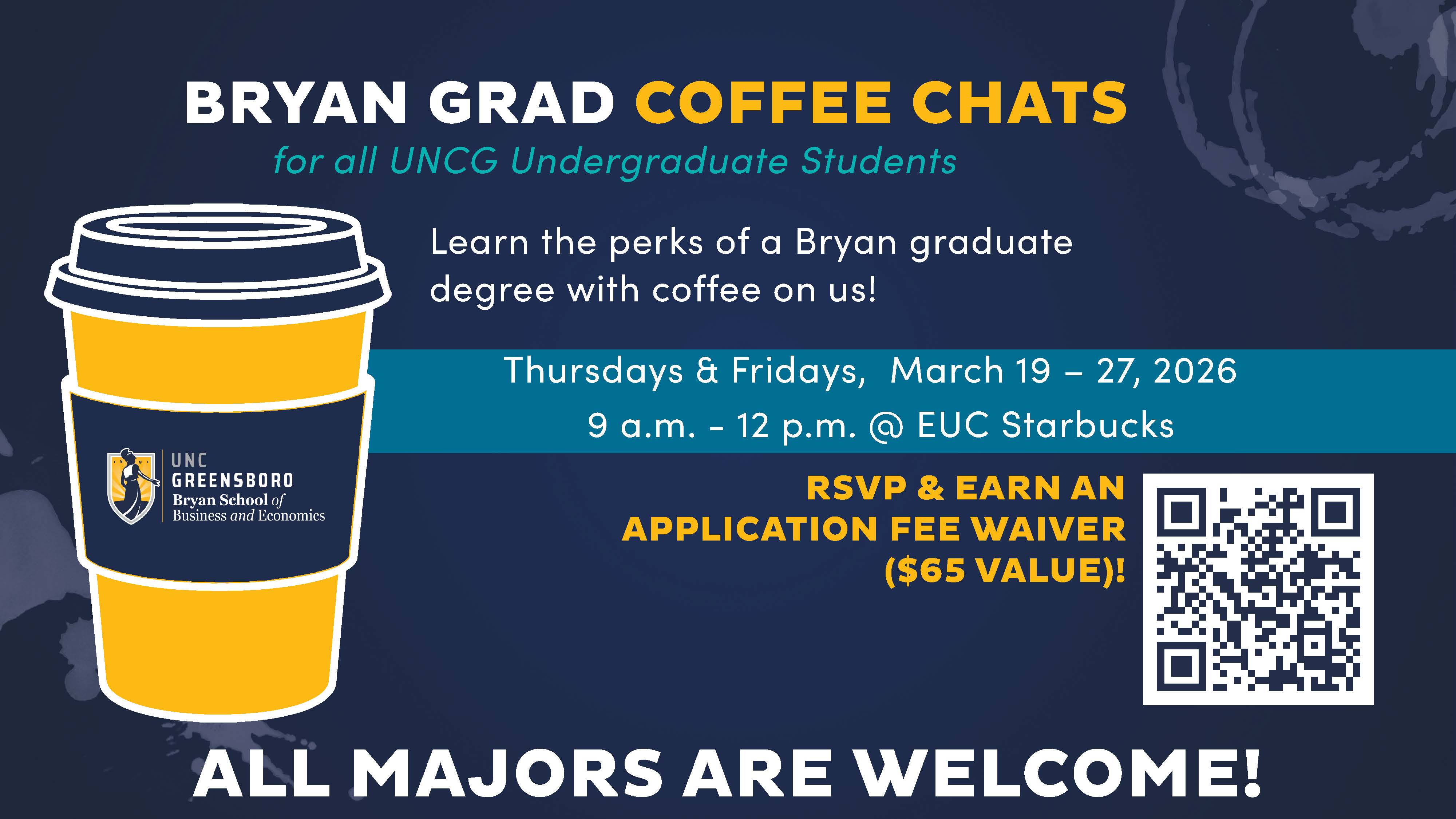 Bryan Grad Coffee Chats @ EUC Starbucksfor UNC Greensboro & Non-UNCG Undergraduate Students The Bryan School of Business and Economics is hosting casual drop-in coffee chats for anyone interested in learning more about master’s and graduate certificate program options. Whether you’re just curious about program timing and costs or you’re ready to apply, we’re happy to meet with you to chat about our programs and help answer your questions. Students from all academic majors are invited to attend! Let us perk up your day while our staff shares the perks of earning a graduate degree such as: Increased earning potential Career advancement Job security Learning new skills And more! Attendees will receive complimentary brewed coffee, Bryan School swag, and a gift card which can be used towards future EUC Starbucks/Bookstore purchases.RSVP in advance to earn an application fee waiver ($65 value)! Loading...Select One Session to Attend:Select One Session to Attend:There are no more scheduled coffee chats this term. Please contact a graduate recruiter to schedule a one-on-one meeting to learn more about Bryan graduate program options.Unable to attend a coffee chat? Click here to set up a one-on-one meeting with a graduate recruiter.First NameLast NameEmail AddressConfirm EmailBirthdateBirthdateJanuaryFebruaryMarchAprilMayJuneJulyAugustSeptemberOctoberNovemberDecember123456789101112131415161718192021222324252627282930312026202520242023202220212020201920182017201620152014201320122011201020092008200720062005200420032002200120001999199819971996199519941993199219911990198919881987198619851984198319821981198019791978197719761975197419731972197119701969196819671966196519641963196219611960195919581957195619551954195319521951195019491948194719461945194419431942194119401939193819371936193519341933193219311930192919281927192619251924192319221921192019191918191719161915191419131912191119101909190819071906190519041903190219011900Mobile NumberEnter your mobile number if you would like to receive text message updates. Read more in our Privacy Policy.Which Bryan School graduate program(s) would you like to learn more about? (select all that apply)Master's ProgramsMaster's ProgramsMBAMS in AccountingMS in IT and ManagementMS in International BusinessMS in Retail StudiesMA in Applied EconomicsGraduate CertificateUnsureNurturing SourceBryan Classroom VisitsProspect SourceBryan Classroom VisitsUNCG AlumniYesSubmit
